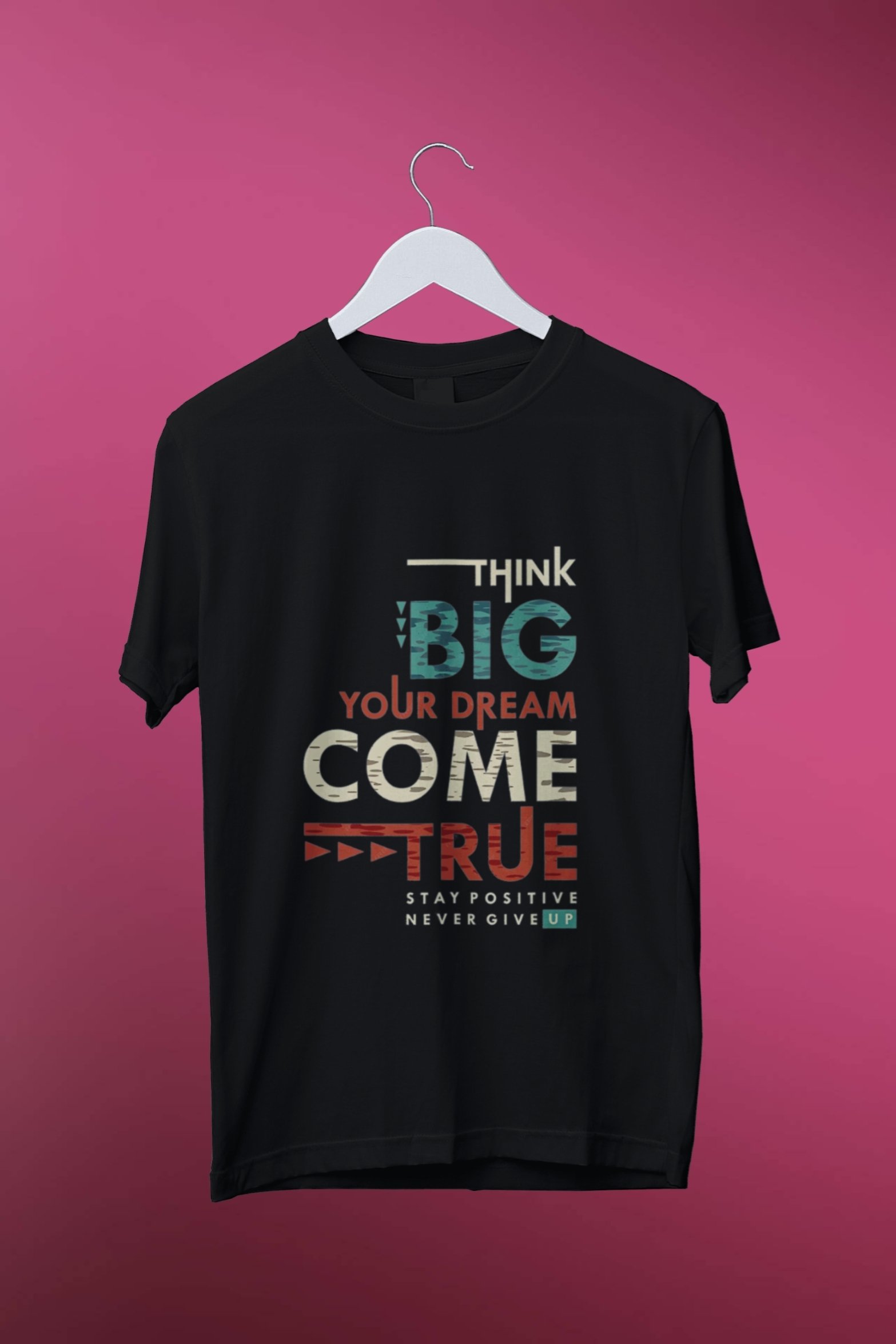 Dream big and believe! This classic black 100% cotton t-shirt boldly states “Think Big, Your Dreams Come True,” a powerful reminder to chase your goals. Comfortable, soft, and profoundly motivational, this tee is perfect for everyday inspiration. Get yours today!